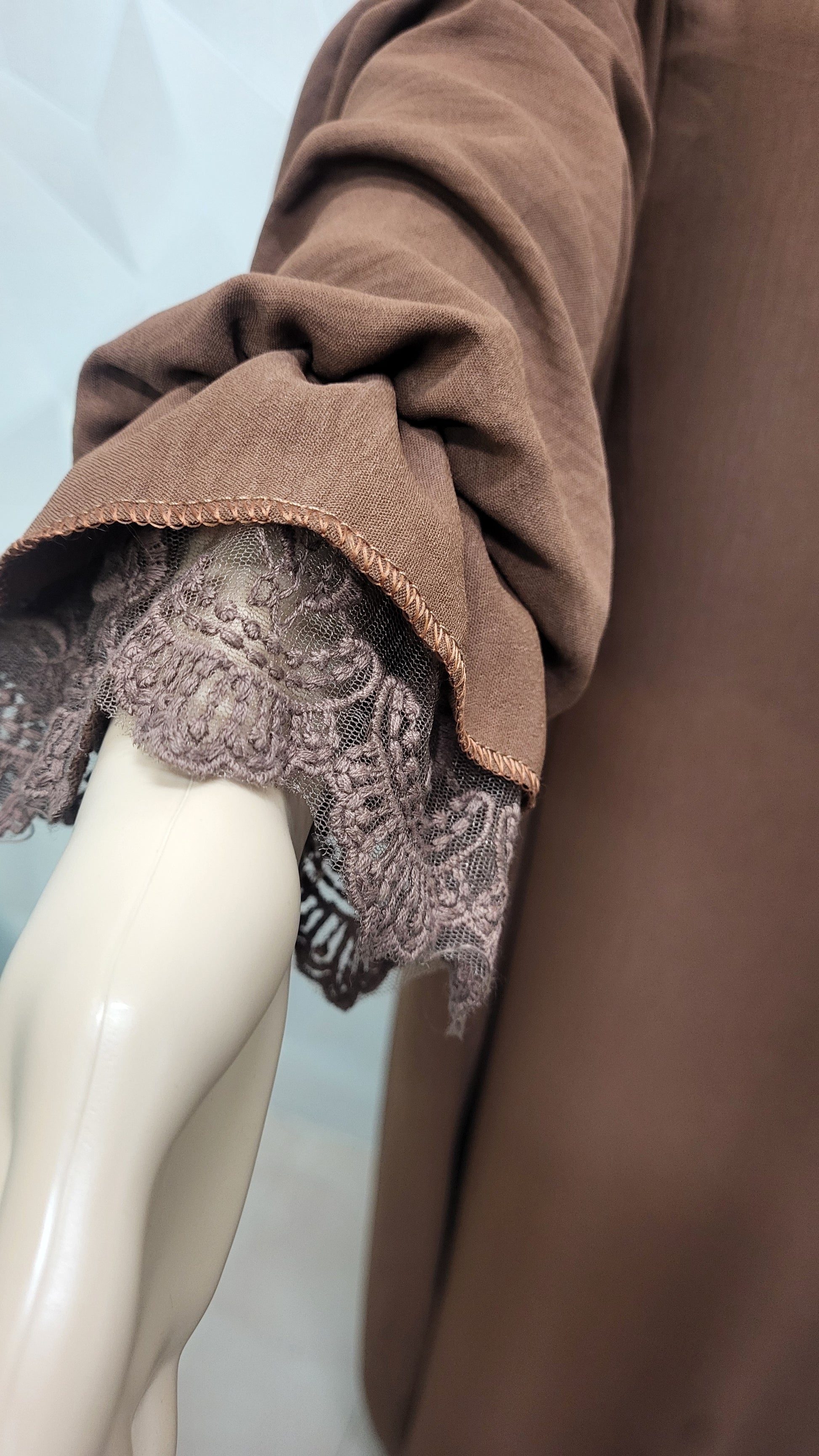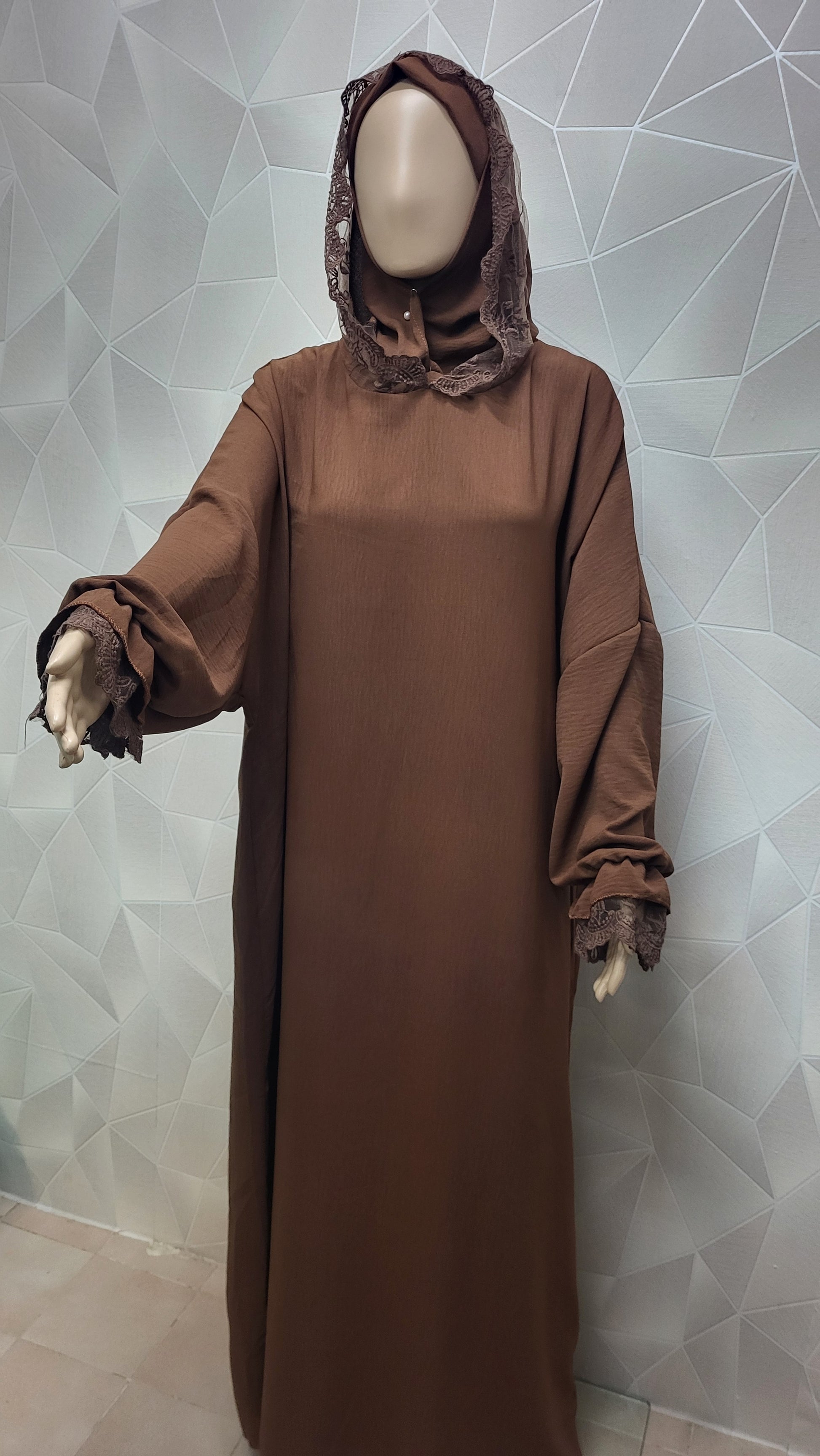 Nuevo modelo de abaya de velo integrado de tela jazz y 'capucha' con encaje. También lleva el encaje en las mangas.